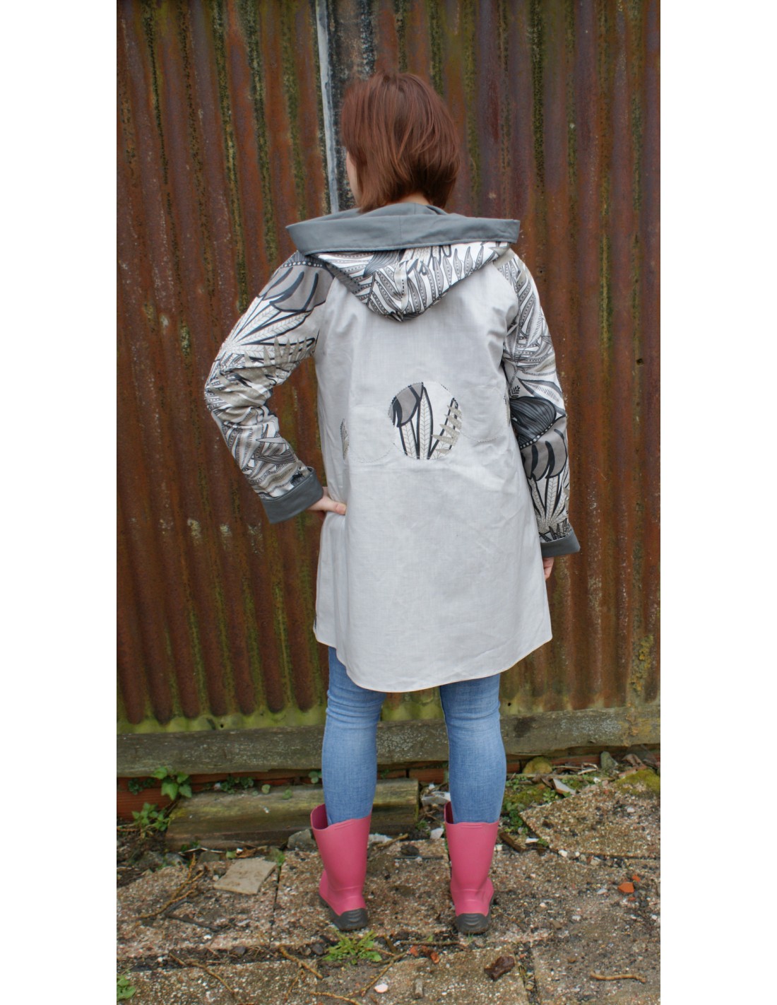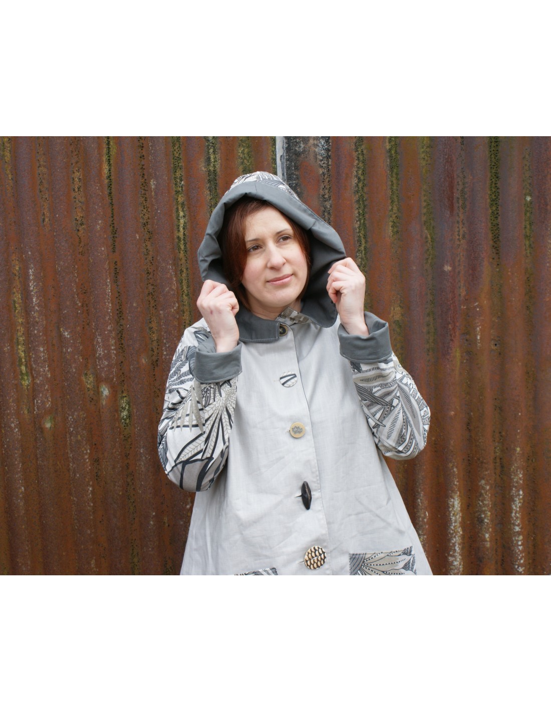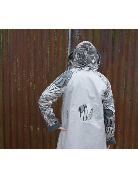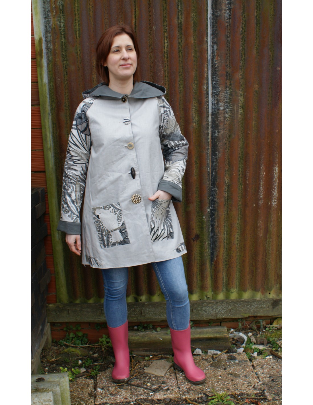 Emmanchures raglans devant et dos pour pouvoir porter une veste ou un gros pull en dessous en gardant toute son aisance. Modèle mi-long, légèrement évasée avec capuche et poignet retroussable en fonction de la longueur de vos bras, se porte ample, fermeture boutonnée avec 5 boutons différents.